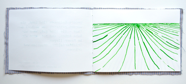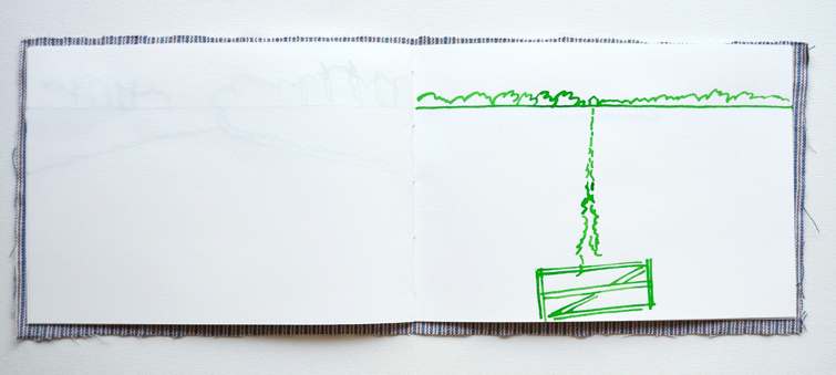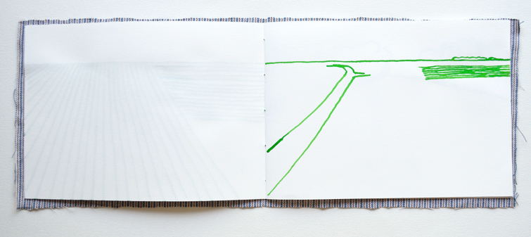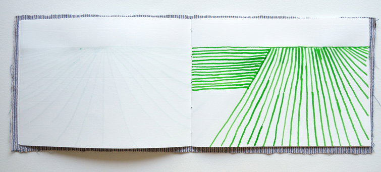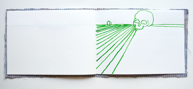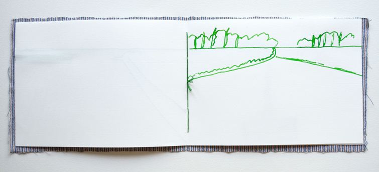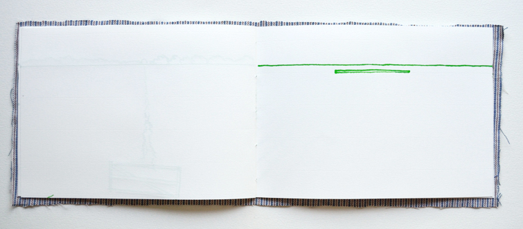 Ink and graphite on paper with fabric cover, 16 x 22 cm.