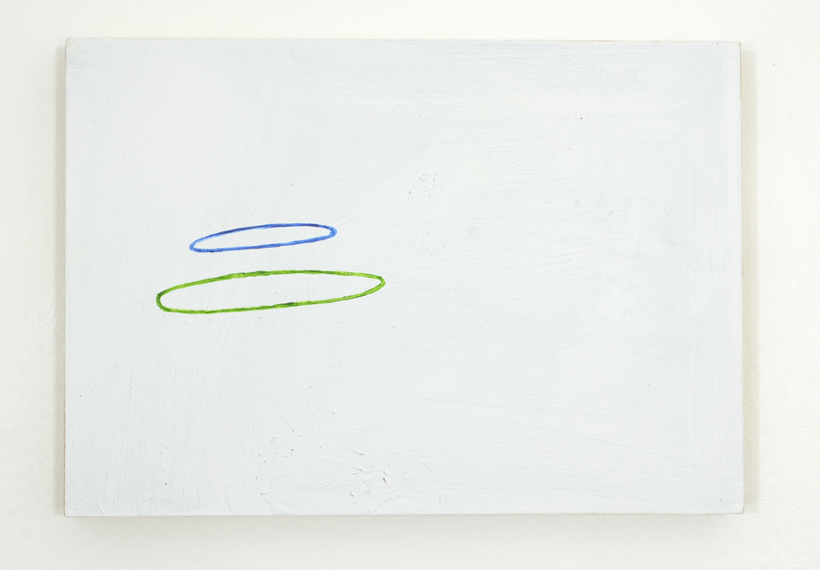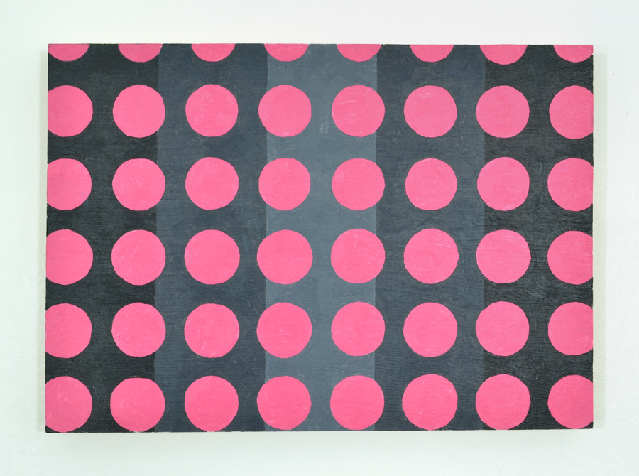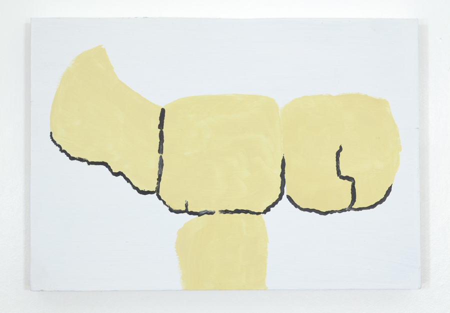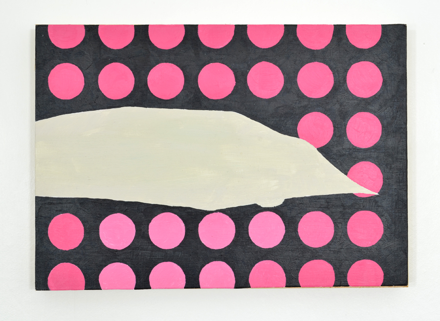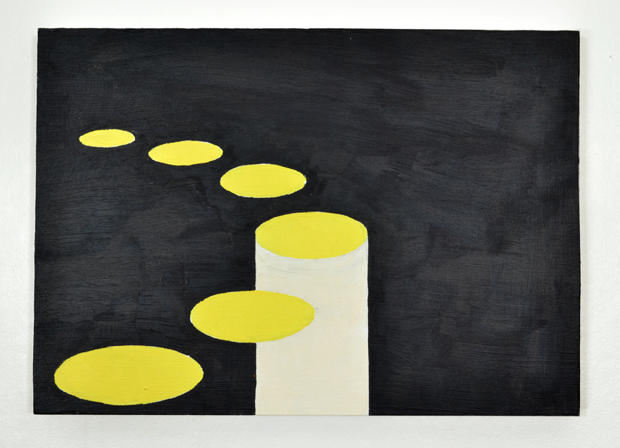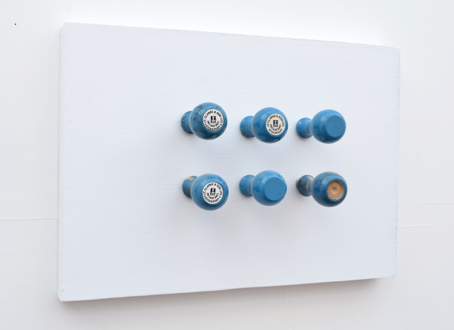 Wooden handles of rubber stamps, acrylic paint on board, 21 x 30 cm.